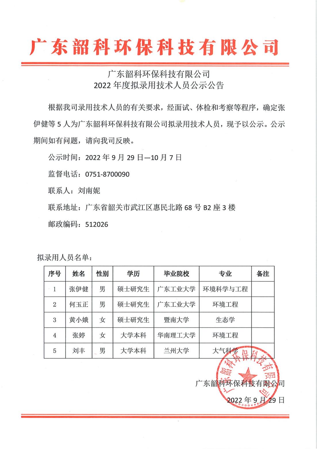 根據(jù)我司錄用技術(shù)人員的有關(guān)要求,經(jīng)面試、體檢和考察等程序,確定張伊健等5人為廣東韶科環(huán)??萍加邢薰緮M錄用技術(shù)人員,現(xiàn)予以公示。公示期間如有問題,請向我司反映。
